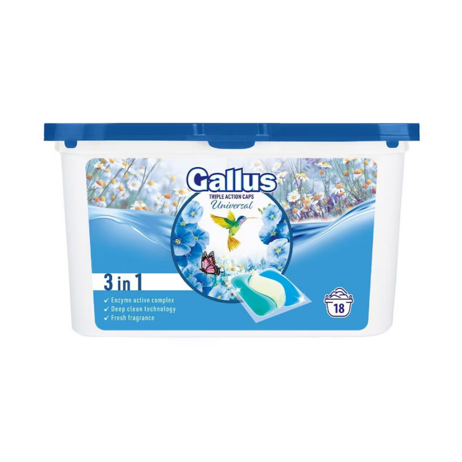 Detergent automat Gallus Universal 3in1 pentru curățare eficientă. Pachet de 18 capsule.