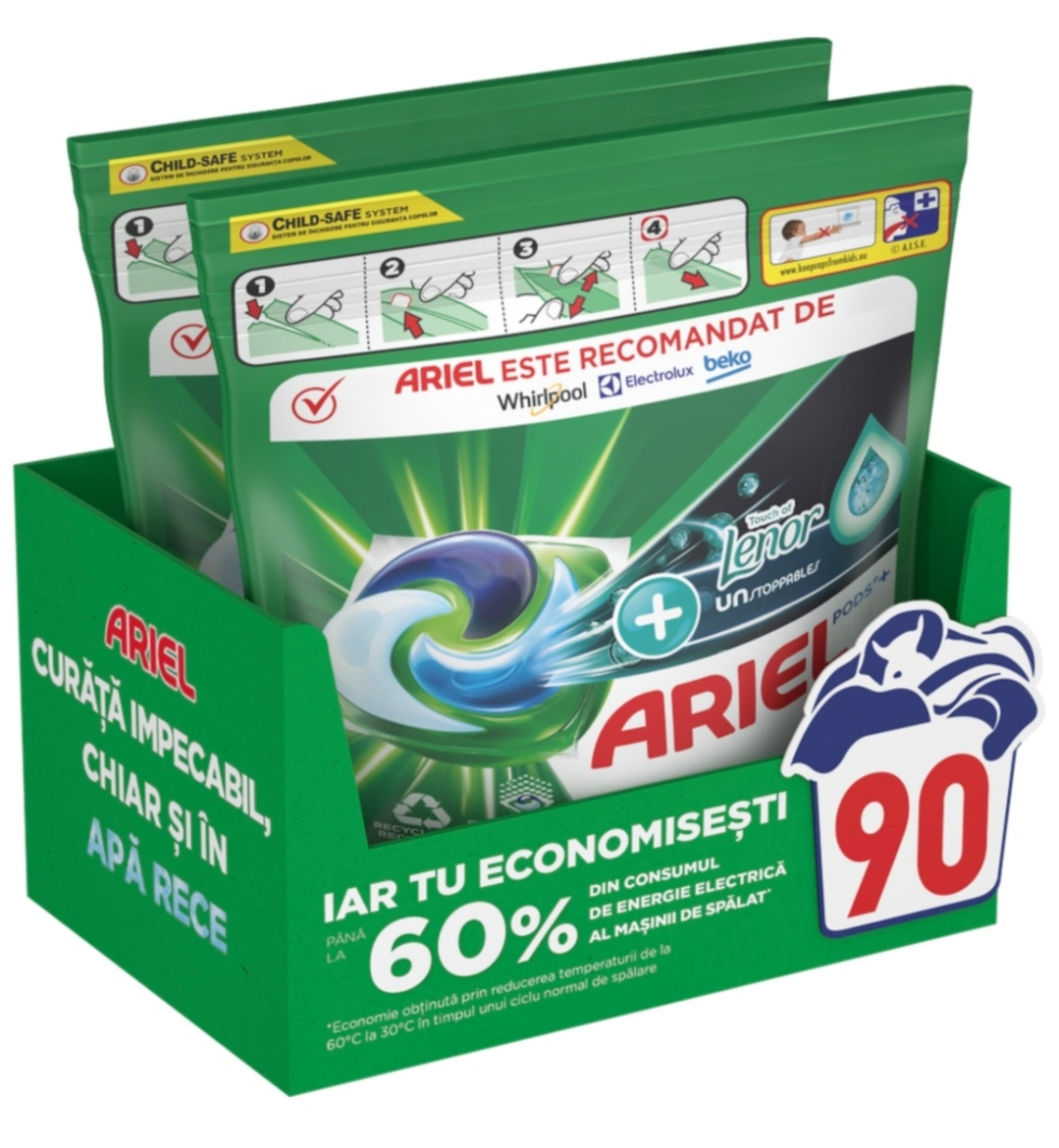 Ariel PODS+ Touch of Lenor Unstoppables, 90 spălări este soluția perfectă pentru cei care caută o curățare eficientă și un parfum de lungă durată pentru hainele lor, oferind o experiență de spălare convenabilă și plăcută.