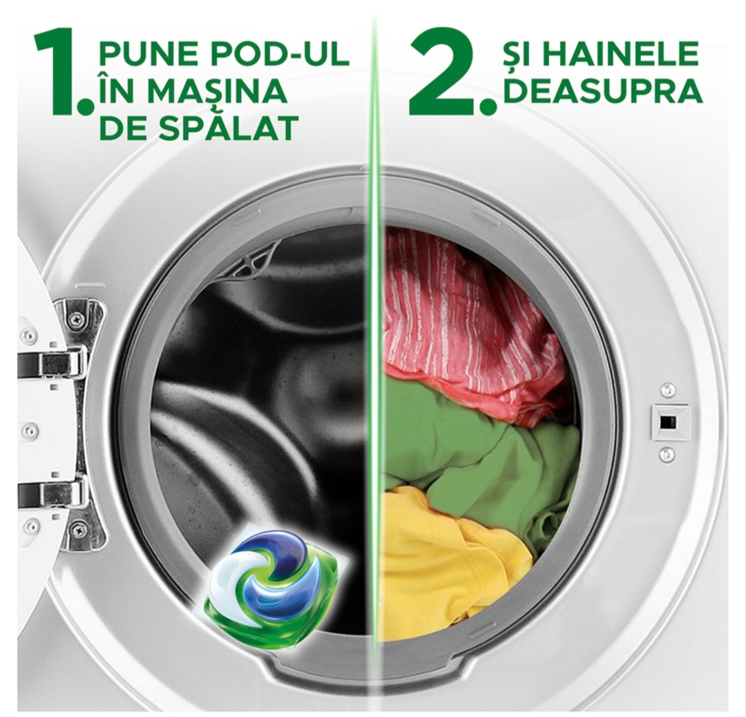 Pentru mașina de spălat: Puneți o capsulă direct în tambur, apoi adăugați rufele. Asigurați-vă că mâinile sunt uscate atunci când manipulați capsulele.